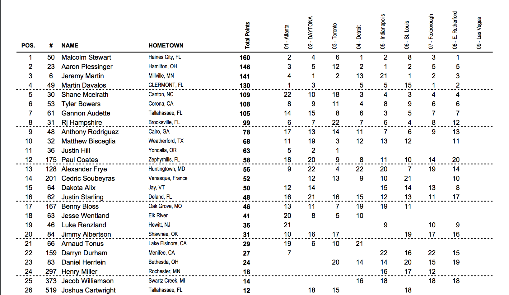 Entering the weekend five points back, Aaron Plessinger salvaged what he could on the night with a fifth. After entering the first lap in fifteenth, Plessinger fought back, but lost valuable points to Stewart and will head to Vegas next weekend fourteen down.