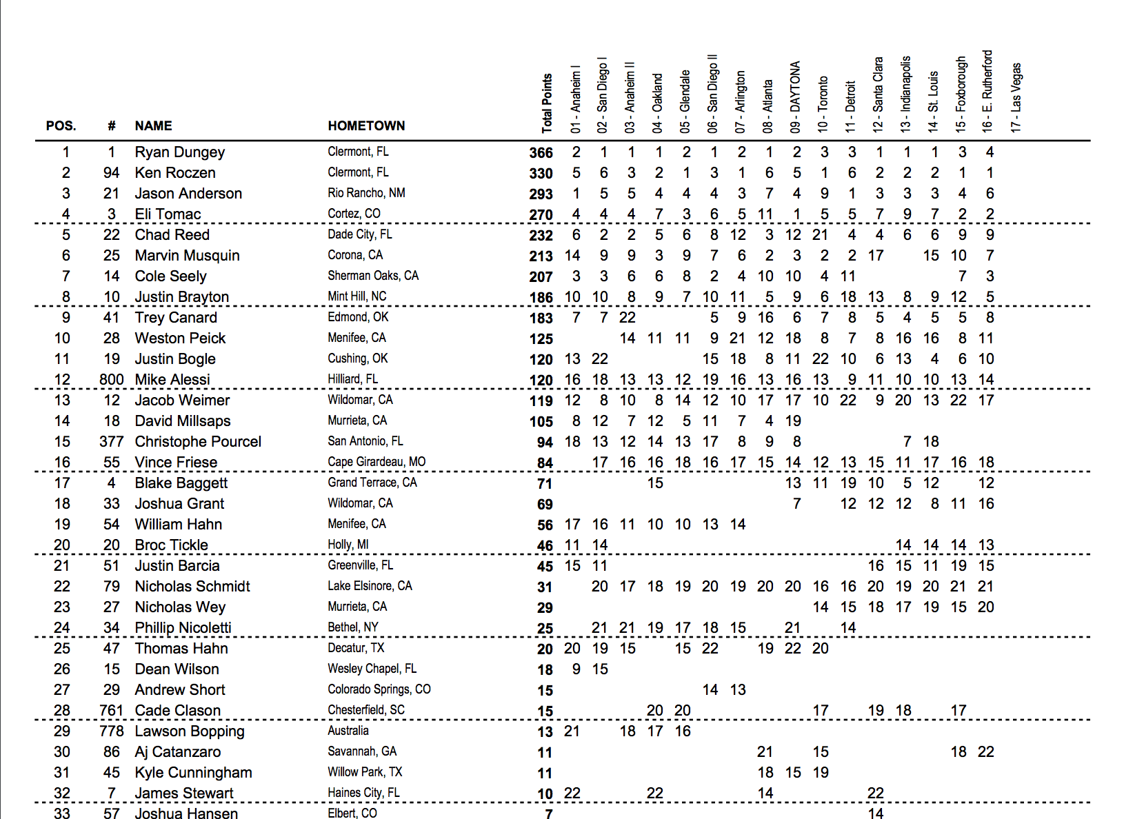 Justin Brayton nearly got Dungey at the finish but had to settle for fifth. Jason Anderson, Marvin Musquin, Trey Canard, Chad Reed and Justin Bogle would round out the top ten.